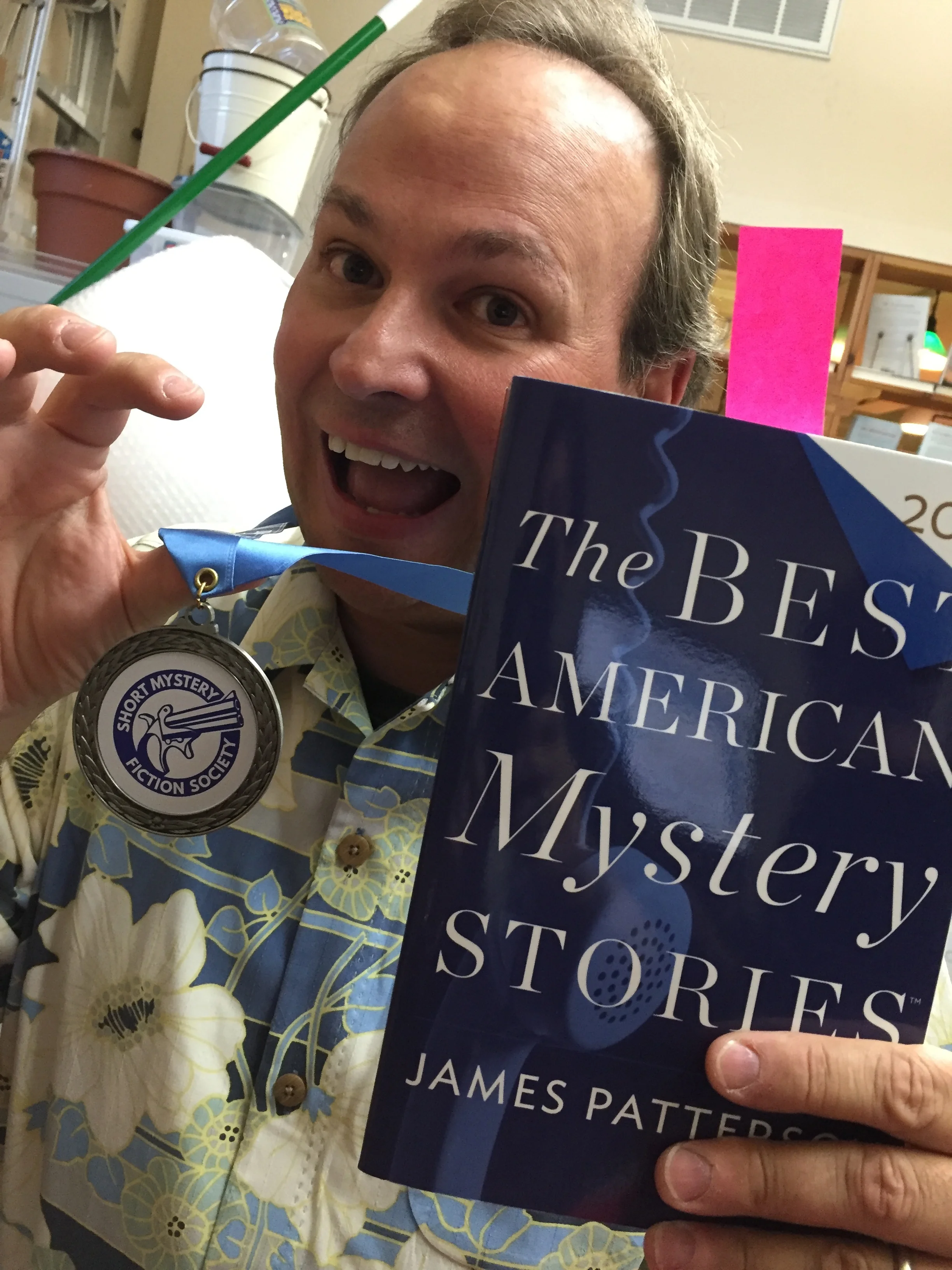I was in a good mood. Only a day before, the new Best American Mystery Stories 2015 anthology had pubbed. As readers here know, I have a story in that collection, “Harm and Hammer,” which pubbed November 2014 in Alfred Hitchcock’s Mystery Magazine. To top it off, on the second night of the con, I’d be receiving a Derringer medal for a 2014 flash fiction story, “How Lil’ Jimmie Beat the Big C.” I got in the car feeling eager and proud.