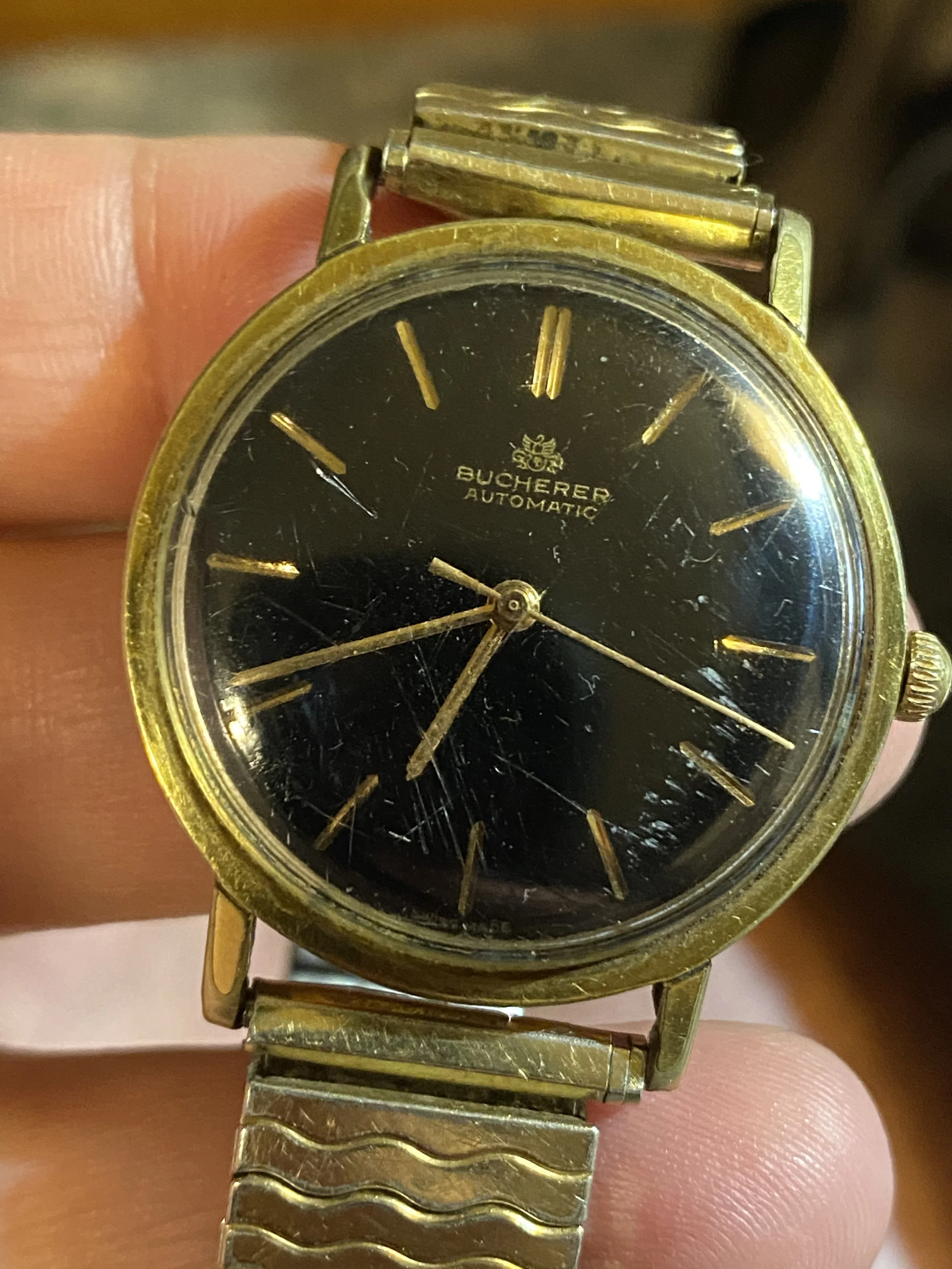 The second of my unworn, closet watches is this one. It was presented to me as a gift from Denise’s grandmother when Denise and I first got married. The watch belonged to Denise’s grandfather, Fausto, and it’s got a wonderful back story. The late Fausto bought the watch in Germany on a trip to visit his first grandchild—my very own Denise—shortly after she was born. Denise’s dad was U.S. military, stationed abroad in Augsburg, Germany. I don’t know if Fausto had ever been out of the country, but on that joyful trip he picked up this watch at a Bucherer jewelry shop, probably in Munich, where they still have a location. Watches that are purchased to celebrate the birth of a child are known in the fandom as, yes, “birth watches.” They are often presented to that child when they reach adulthood. Yet despite this charming history, I never really wore the watch. I didn’t quite understand how to keep it wound. Grandma gave me vague instructions; I was to shake it in my hand as if I were a kid at Hogwarts weaving an incantation. It was fussy, and also old, and I was afraid to break it if I wore it. At Scholastic, I was always smacking my wristwatch into walls or doors as I walked around the office. That’s why I liked my Timex. Takes a licking, and keeps on ticking, right? Fausto’s watch also came on a clingy old Spiedel Twist-O-Flex bracelet that ate my wrist flesh every time I pulled it on. Upon closer inspection I discovered that the band was also chewing into the watch lugs. If I wore it, I might inadvertently saw the lugs off. But I didn’t have the patience to figure out how to change out the bracelet. Into the closet it went. (The day I’m writing this, it was announced that Rolex bought Bucherer. Nice, but that still doesn’t make this a Rolex watch.)