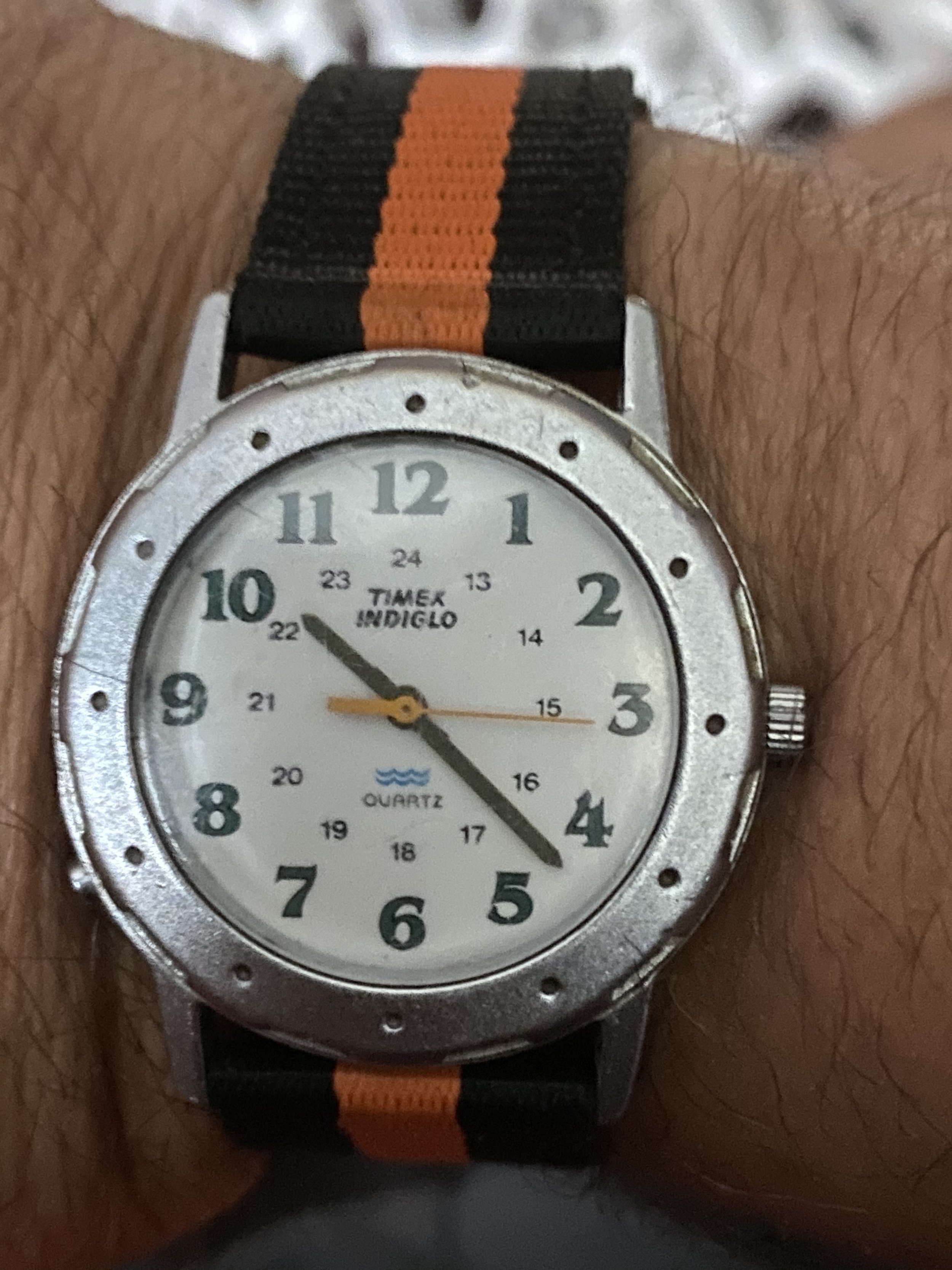 There was a time when I wore a watch every morning when I went to work in the big city. This is the watch. A cheap-ass Timex that I must have bought in my hometown in New Jersey for about $15 at the Kmart. Ugliest pot metal case and bezel you’ve ever seen. Scratched and dinged as hell, because I’m bad with watches. It was fine for what I needed. The classic Indiglo feature lit the thing up like a radioactive wafer whenever I wanted to check the time while I was at the movies. (I used to go to a lot of movies, in actual theaters, back in the day.) When I was living in Italy for a year, I liked that this watch displayed the 24-hour clock that is so popular in Europe. That inner ring of indices also helped me calculate the time back home in the USA. But I stopped wearing the watch when I got back to the states because by then I had started obsessively checking my mobile phone for the time. The Timex got tossed in a drawer. The battery died, and no one cared, least of all me.
