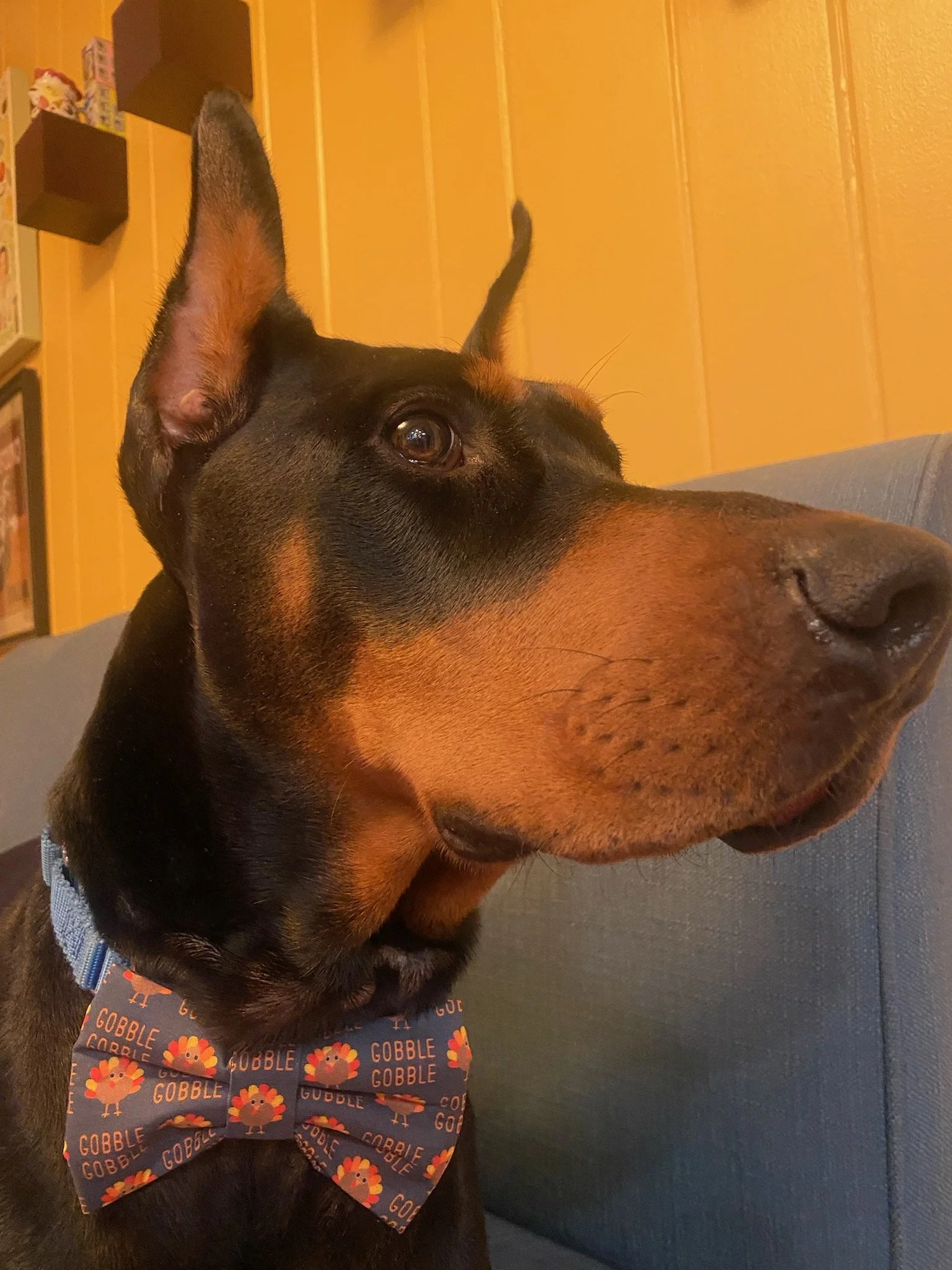 We don’t dress him up like this all the time because he’s liable to soil or destroy anything nice attached to him. But when it’s time to party and model, he’s on! If you have a dog, you might want to check out the wares offered in the etsy shop of Uptown Girl Dogwear. Great maker and great products. Bear in mind that our kitchen lighting isn’t the greatest, but I think you’ll love the seemingly inexhaustible selection of holiday bowties in that shop.