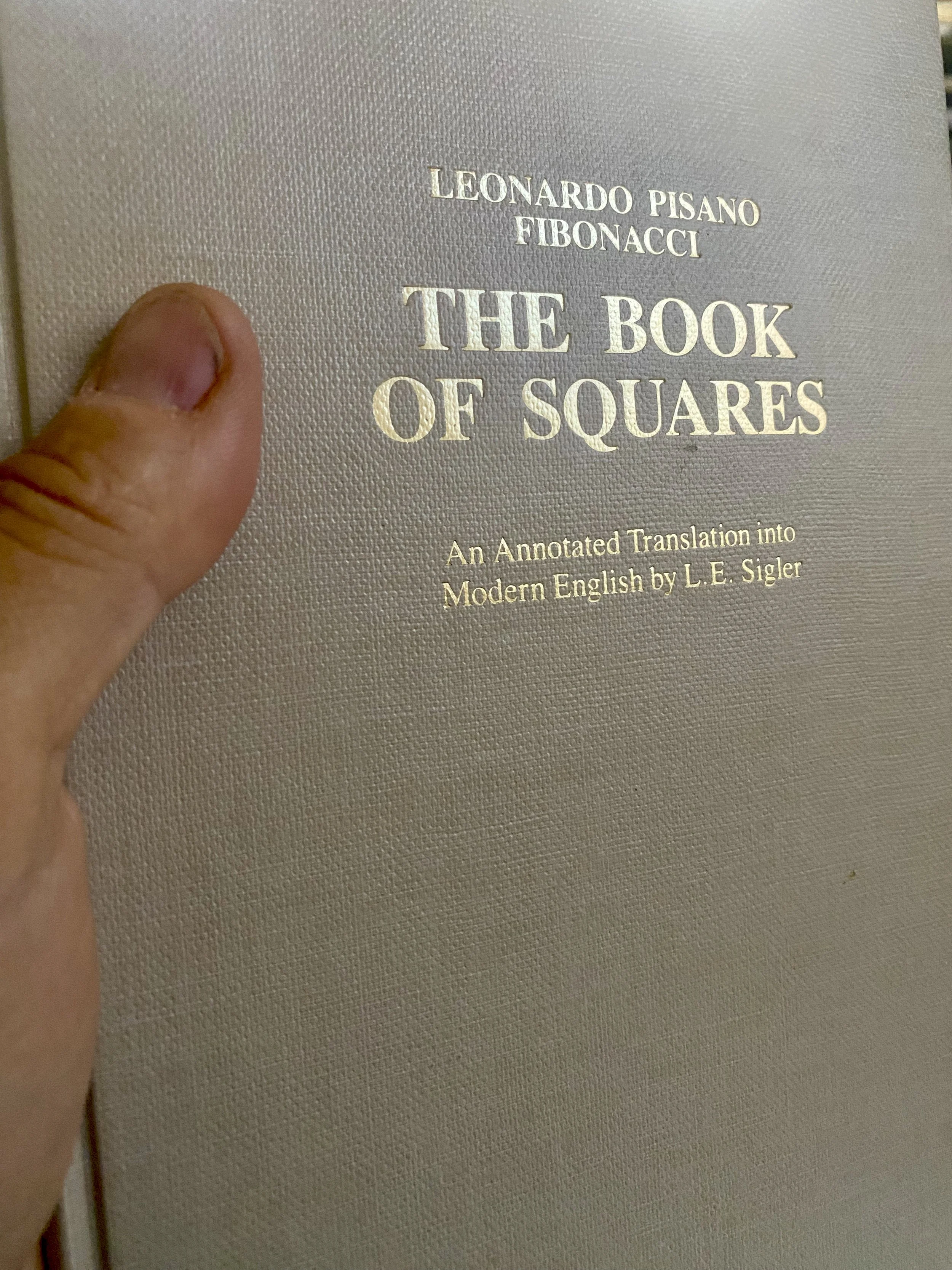 One of Sigler’s translations, published in 1987, was available around the time I was writing my children’s book about Fibonacci. I was excited to get my hands on the so-called Book of Squares, which may be the third of Fibonacci’s five books (that we know of). I knew the book would be way over my head as a generalist. But it was fun to page through.