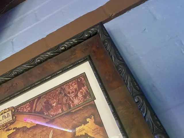 We decided to go all in, and told the framing store that we wanted a frame that matched the old style of the map and the entire Indy franchise. We landed on this rustic-style wooden border.