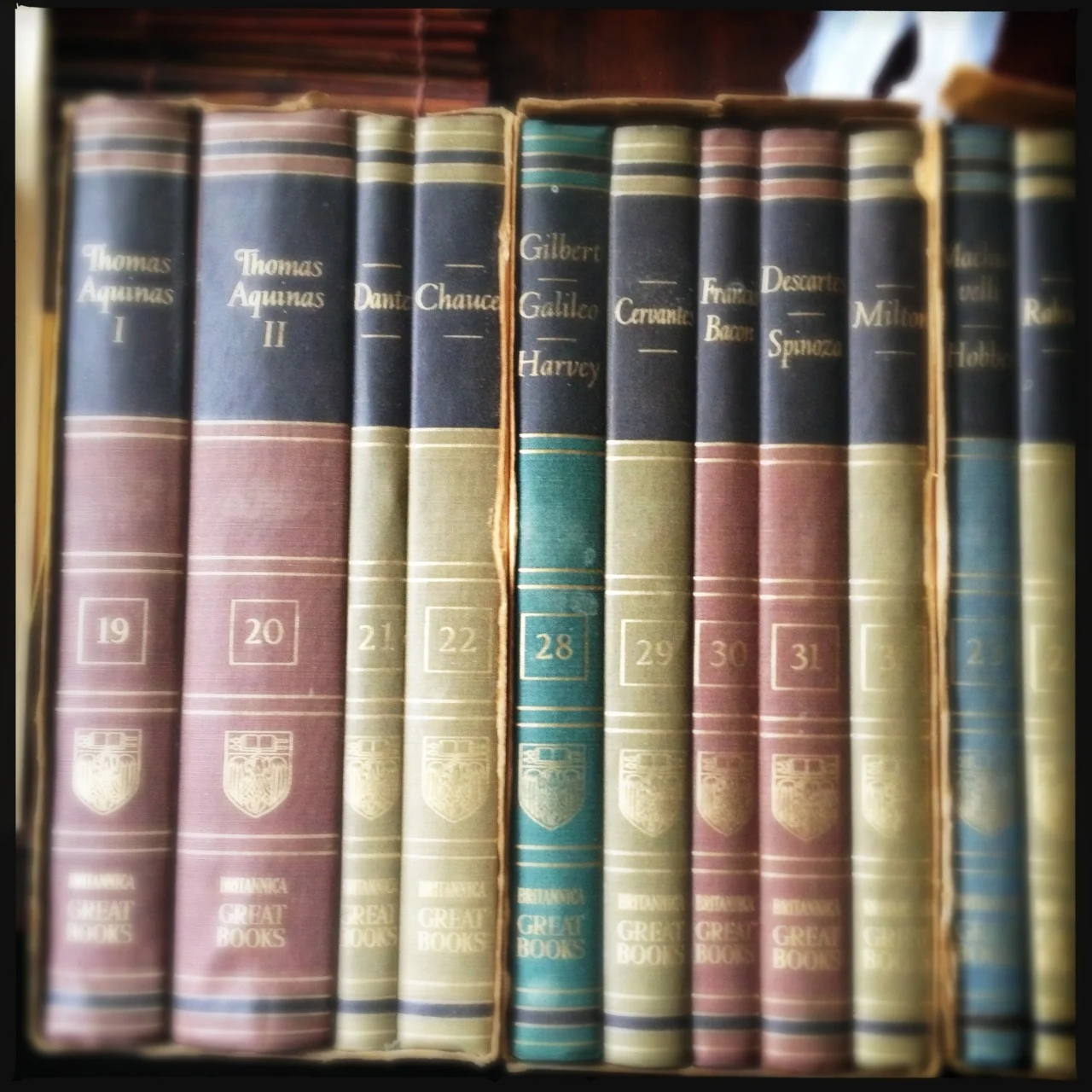 My dad bought the Great Books of the Western World from a door-to-door salesman back in the 1960s. He says he had to haggle mightily to get the entire 50+ book set for about $300. Dad never went to college, but he fancied himself a lover of the classics. I don’t know that he ever really touched the series, which was dreamed up in the early 1950s by Encyclopedia Brittannica. I grew up staring at these books; they occupied several shelves in our home, next to other relics of my dad’s bachelor days, like his hi-fi stereo.